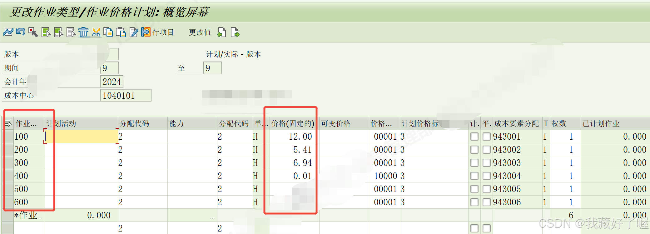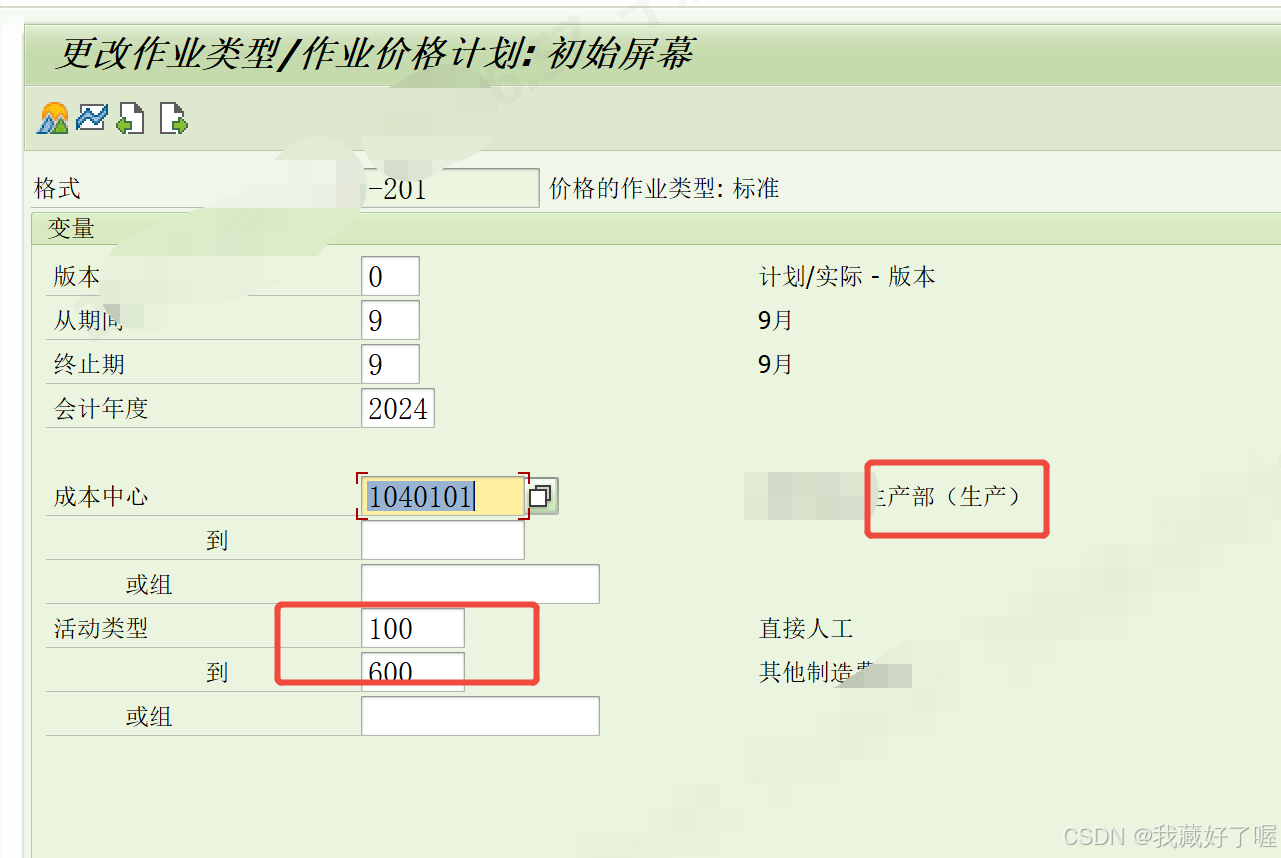 输入制造类型的成本中心,为作业类型分配计划价格
