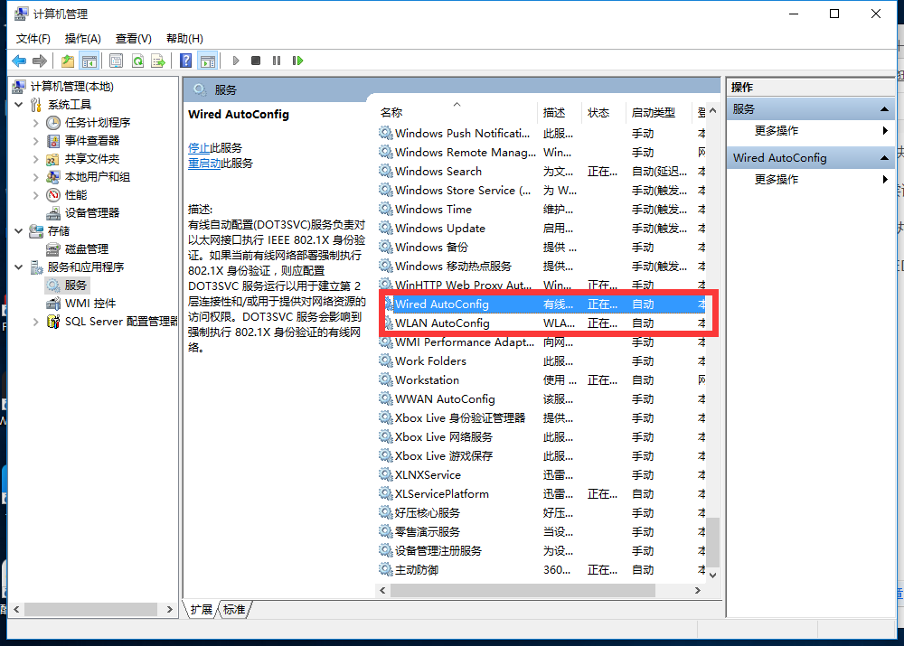 第三,右击的电脑,打开管理,然后找到服务和应用程序,在服务中找到开头是Wired的一个设置。将红色框中的设置改为停止运行,并且禁止。这个是一个有线的身份验证,下边的是无线的,大家可以看看。然后再去尝试链接。