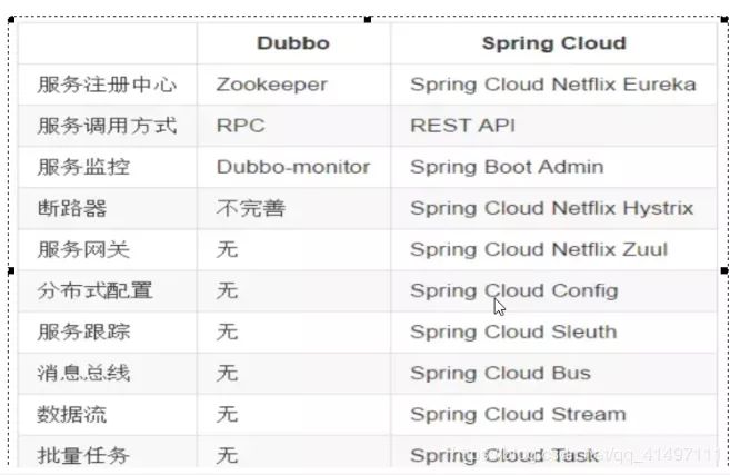 (2)Dubbo 只是搭建了分布式的框架,完成了最基本的 远程调用/服务注册和发现/监控; SpringClound 完成了微服务的整套理论架构;