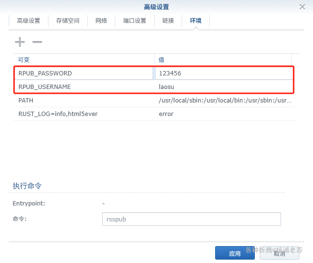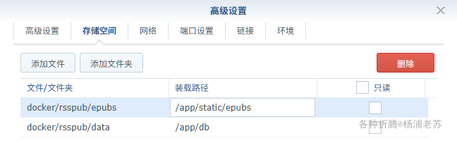 docker/rsspub/data | /app/db | 存放数据库文件 |