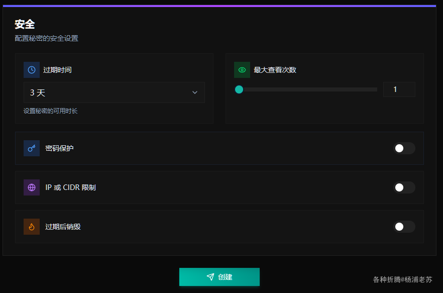 AES-256-GCM加密,确保数据在离开用户浏览器之前进行加密。 - 自销毁秘密:配置秘密的到期时间和查看限制,增强信息的安全性。