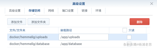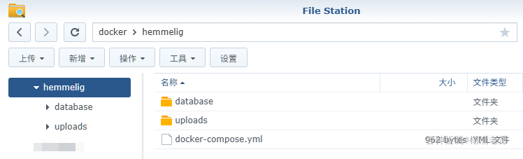 在 docker 文件夹中,创建一个新文件夹 hemmelig,并在其中建一个子文件夹 database 和 uploads