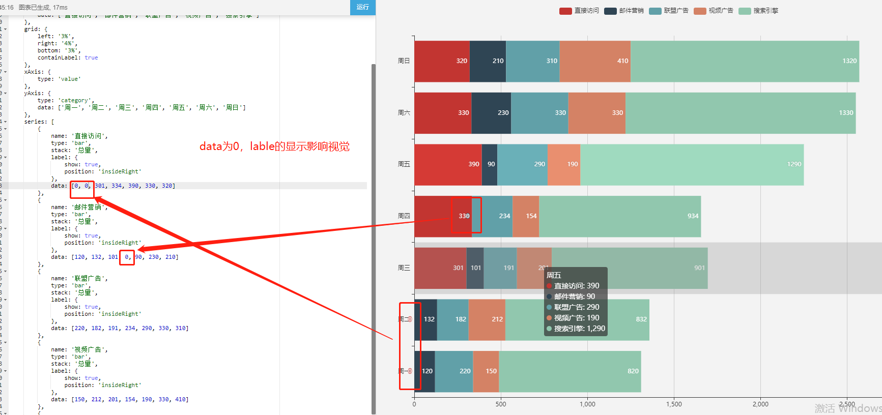 【echarts】data的值为0时隐藏label,不为0时显示 在饼图和柱状图中,我们为了图文展示更清晰经常会设置lable为true,但当有些数值为0时,label的展示在一定程度上影响了视觉效果,此方法根据值来设置lable的显示隐藏,以官网上柱状图堆砌图为例:具体方法如下: label: { show: true, color:'#333', position: 'insideRight', formatter:function (params)