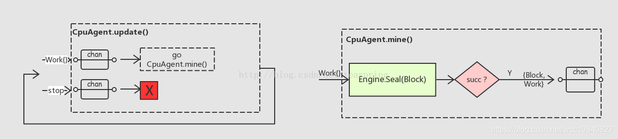 - CpuAgent.mine() 利用Engine实现体的共识算法对传入的Block进行最终的授权, 如果成功,就将Block同Work一起通过channel发还给worker,那边worker.wait()会接收并处理