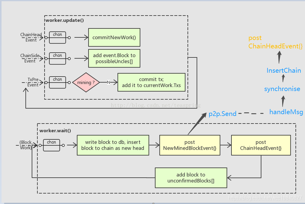 worker自己生成新的区块并入链后,会向全网广播NewMinedBlockEvent,同时也会给自己发一个ChainHeadEvent,之后就跟上面的一样