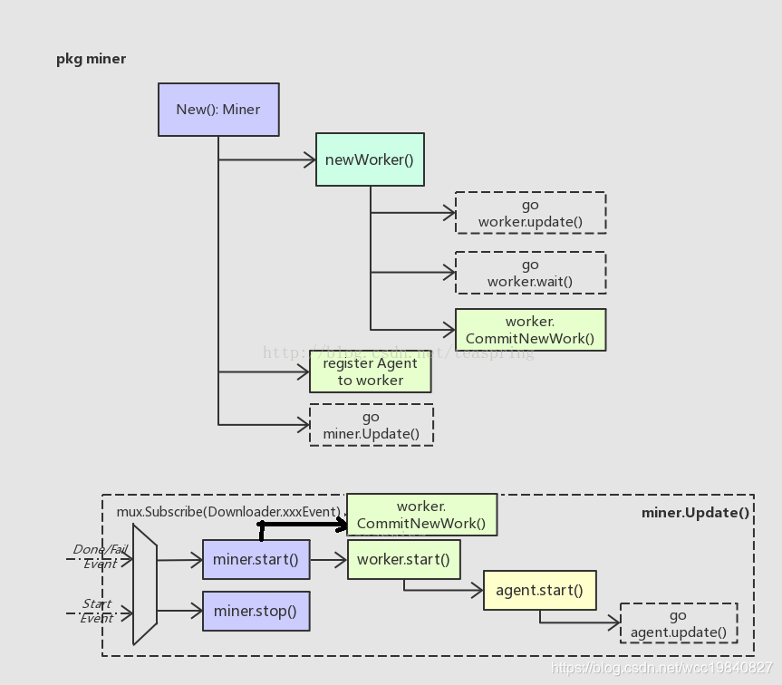 - miner.Start() -> worker.start() -> agent.Start() -> go agent.update()