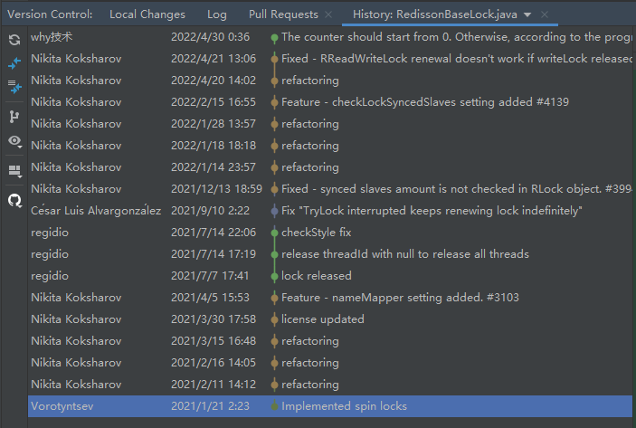 比如上面这个界面中,就可以看到 RedissonBaseLock.java 这个文件,由谁在什么时候进行过变更,以及变更对应的 commit 信息是什么。