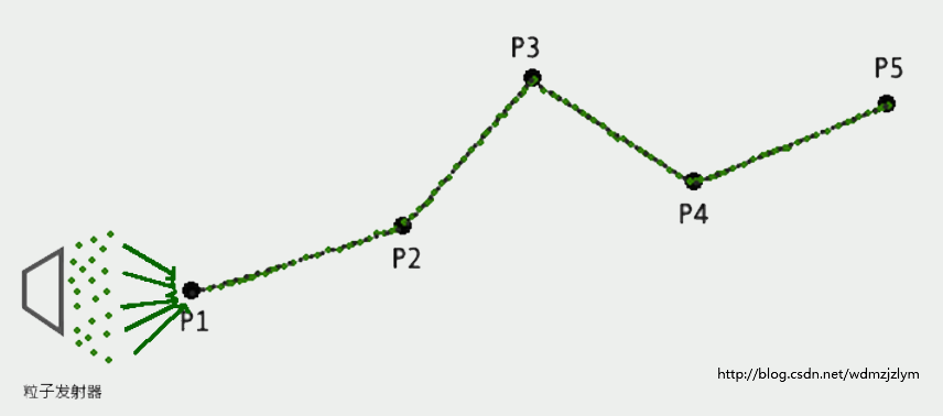 首先呢创建一个粒子发射器,我们打算让其中产生的粒子按照如下(P1--->P2--->P3--->P4--->P5)的方向依次移动,就是下图这样的思路: