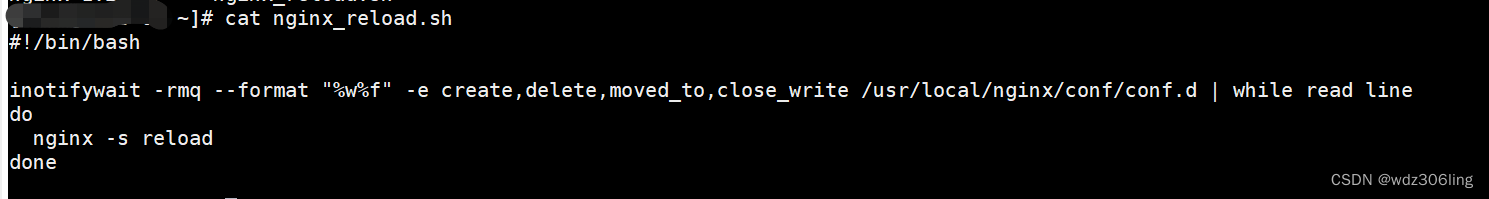 inotifywait -rmq --format "%w%f" -e create,delete,moved_to,close_write /usr/local/nginx/conf/conf.d #监控本机/usr/local/nginx/conf/conf.d目录的变化