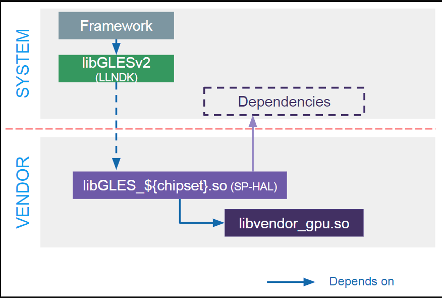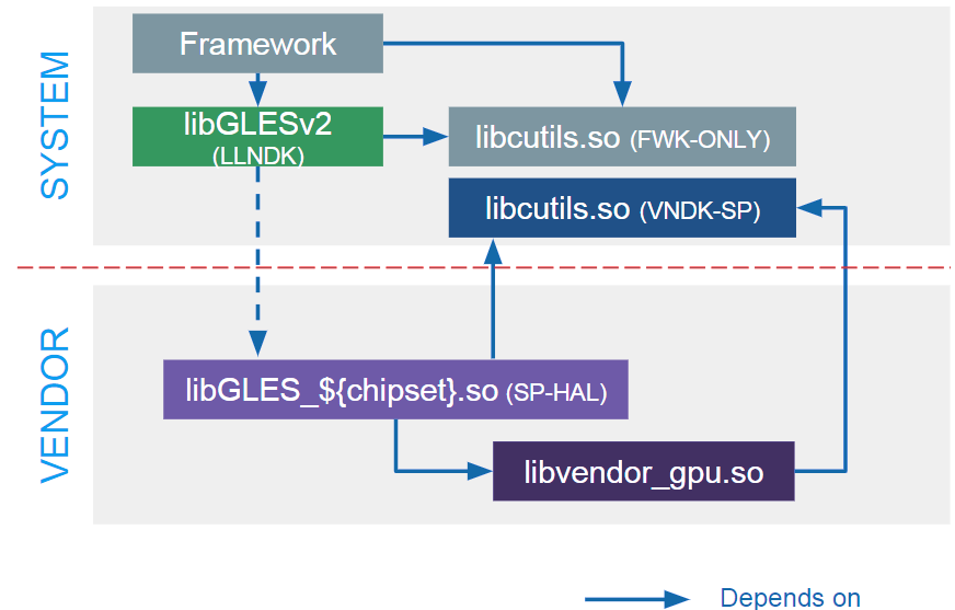 属于 framework的 surfaceflinger 和 vendor 的 libGLES_${chipset}.so 都要依赖 libcutils.so,同样要遵循 VNDK 的要求,将 libcutils.so 一式两份,其中libcutils.so为 VNDK-SP。