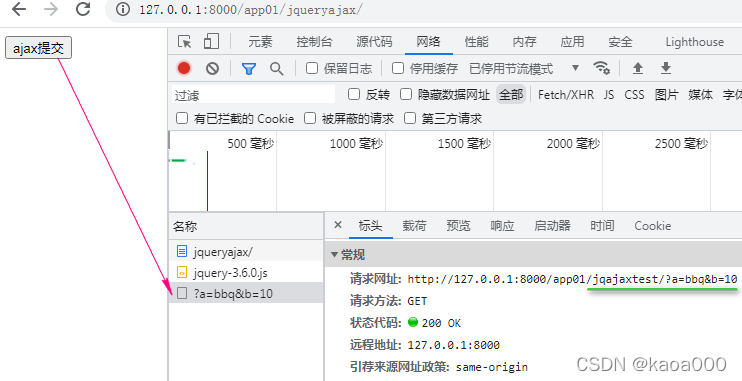 结果与第一种相同,ajax将参数的字典键值对给拼接到了请求网址的后面。
