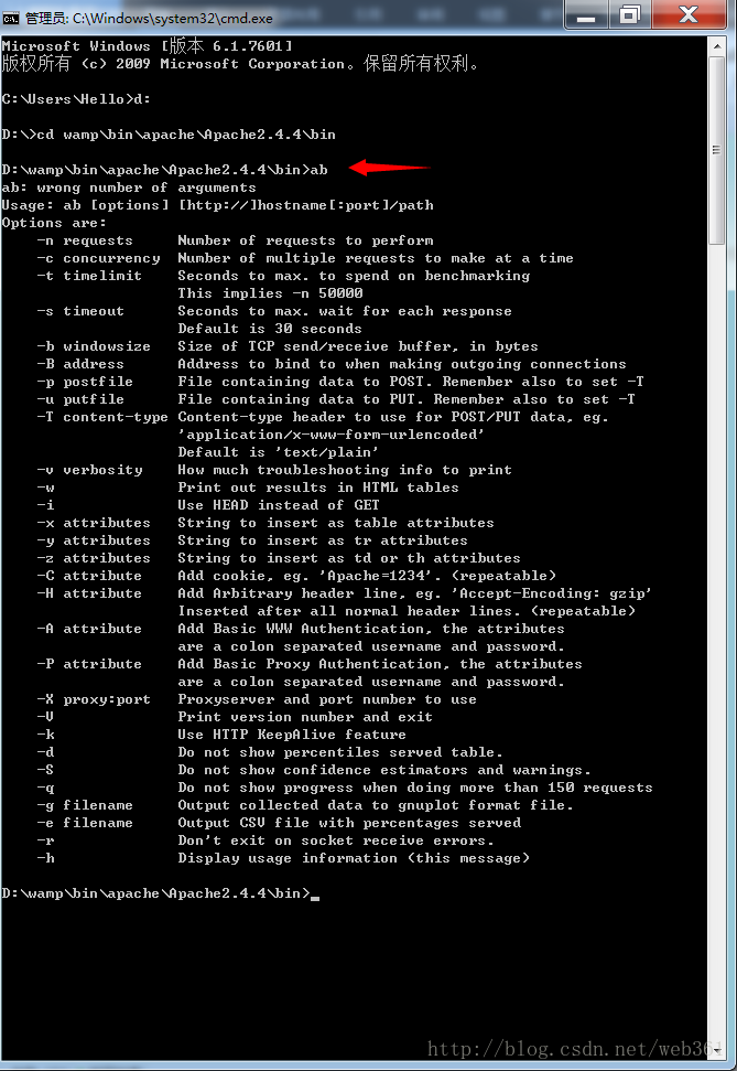 如果看到下列一些帮助信息就说明成功启动ab