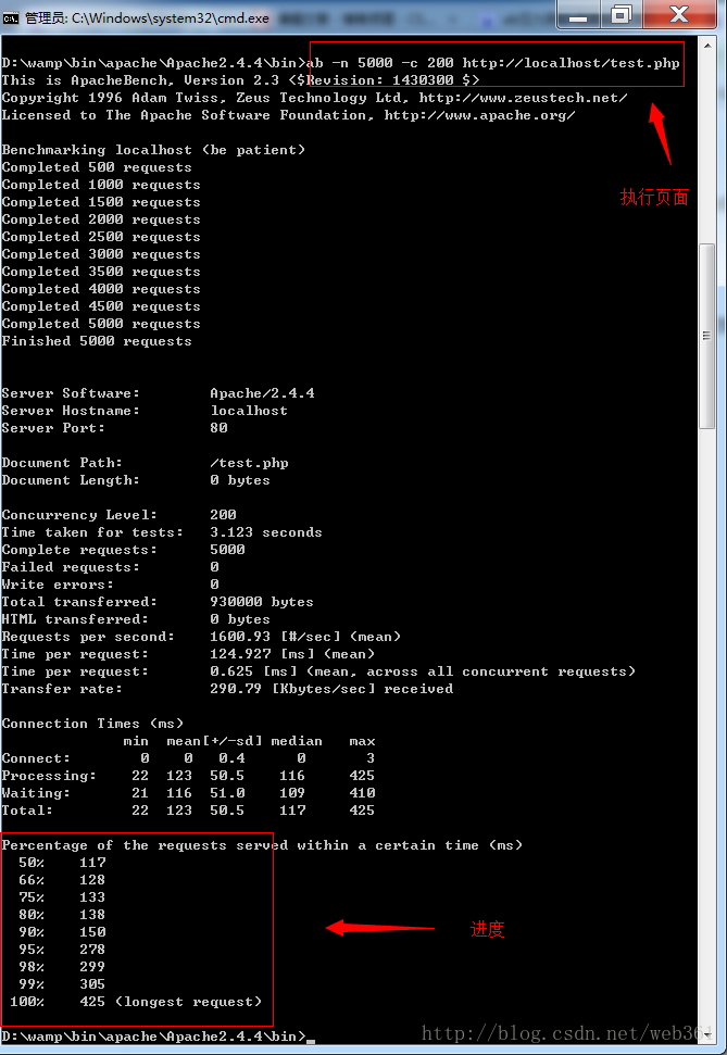 上例表示总共访问http://localhost/test.php这个脚本5000次,200并发(模拟200个用户同时访问)。