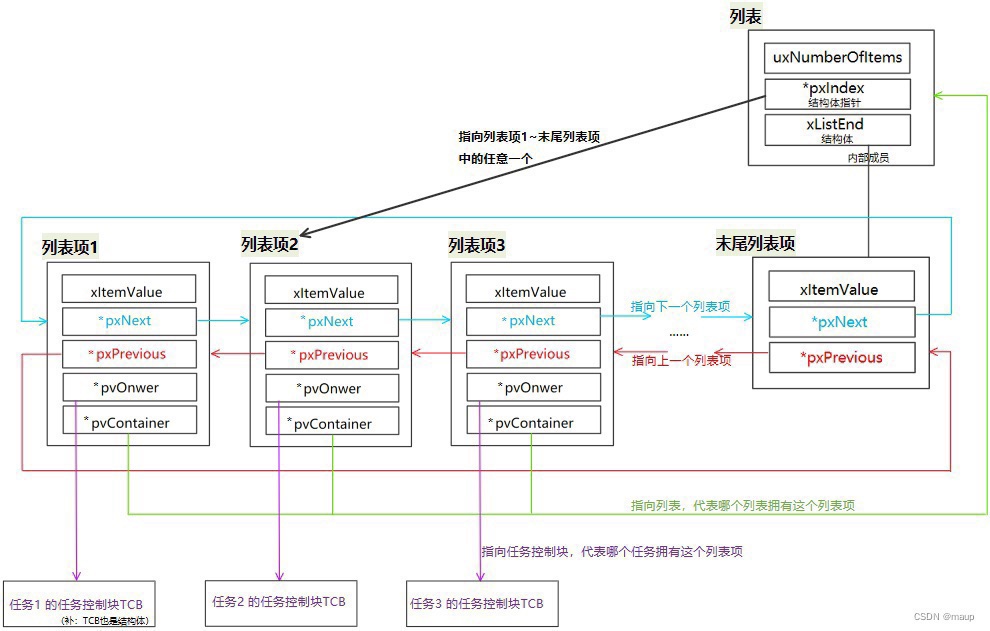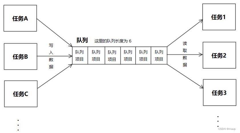 队列是任务跟任务之间、任务跟中断之间进行数据交流的一种机制。队列图示如下:任务往队列写入数据,称为入队。从队列中读取数据,称为出队。入队和出队函数的内部都调用了临界段保护函数,禁止了任务的调度,保护了任务在读写时的数据,防止多个任务同时访问队列数据造成冲突。队列的存放数据的空间是有限的,空间大小可以在创建队列时指定。队列空间可以看成由多个存放数据的小盒子组成,这些小盒子称为“队列项目”,队列项目的大小单位为字节,小盒子的总数就是队列长度(如下图)。在创建队列时,就要指定队列项目的大小和队列长度。