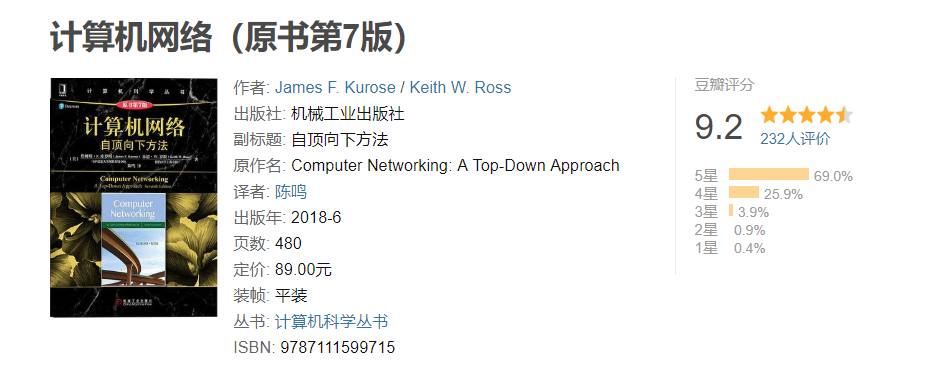 ❝本书是经典的计算机网络教材,采用作者独创的自顶向下方法来讲授计算机网络的原理及其协议,自第1版出版以来已经被数百所大学和学院选作教材,被译为14种语言。