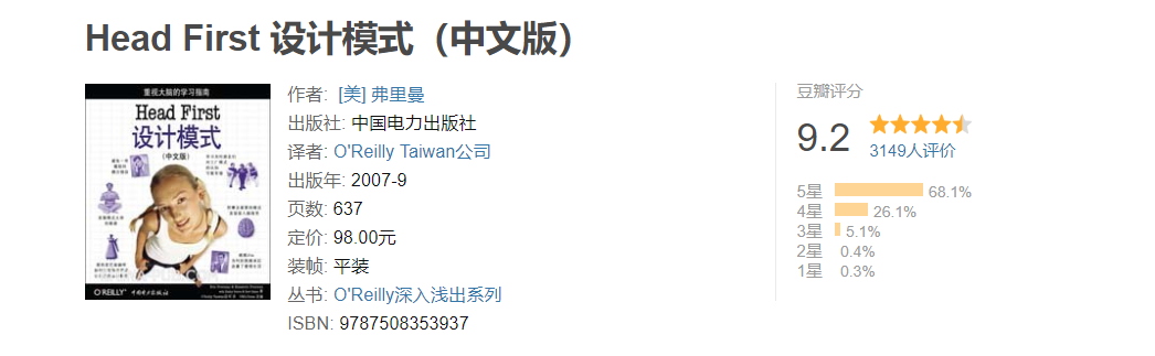 ❝本书涵盖了23个设计模式,例子简单易懂,抛砖引玉,读起来很有意思的。真的是一本非常赞的设计模式入门书籍