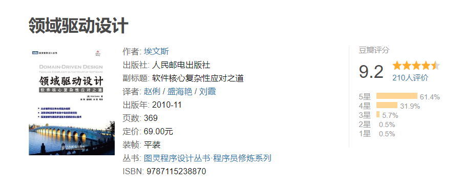 ❝《领域驱动设计:软件核心复杂性应对之道》是领域驱动设计方面的经典之作。全书围绕着设计和开发实践,结合若干真实的项目案例,向读者阐述如何在真实的软件开发中应用领域驱动设计。