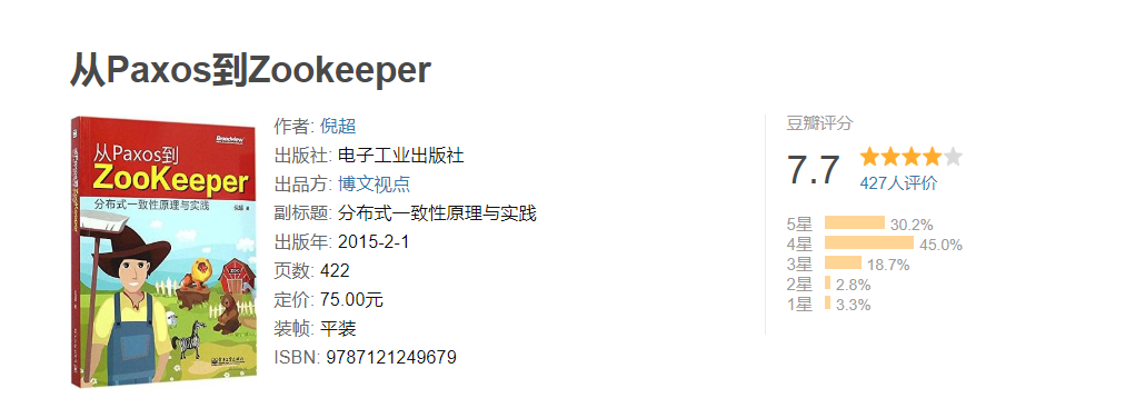 ❝《Paxos到Zookeeper:分布式一致性原理与实践》从分布式一致性的理论出发,向读者简要介绍几种典型的分布式一致性协议,以及解决分布式一致性问题的思路,其中重点讲解了Paxos和ZAB协议。同时,本书深入介绍了分布式一致性问题的工业解决方案——ZooKeeper,并着重向读者展示这一分布式协调框架的使用方法、内部实现及运维技巧,旨在帮助读者全面了解ZooKeeper,并更好地使用和运维ZooKeeper。