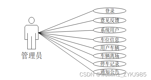 系统中的核心用户是系统管理员,管理员登录后,通过管理员菜单来管理后台系统。主要功能有:首页、系统用户、车位信息、用户车辆、车辆入场、车辆离场、停车记录、通知公告、意见反馈等功能。管理员用例如图3-7所示。