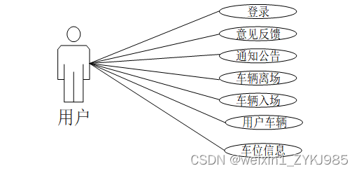 用户进入系统可以进行首页、车位信息、用户车辆、车辆入场、车辆离场、停车记录、通知公告、意见反馈功能等。用户用例如图3-8所示。