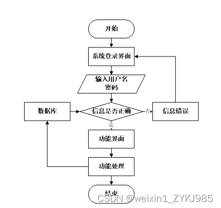 用户打开并进入系统后,会先显示登录界面,输入正确的用户名和密码,系统自动检测信息,若信息无误,则用户会进入系统功能界面,进行操作,否则会提示错误无法登录,操作流程如图3-3所示。