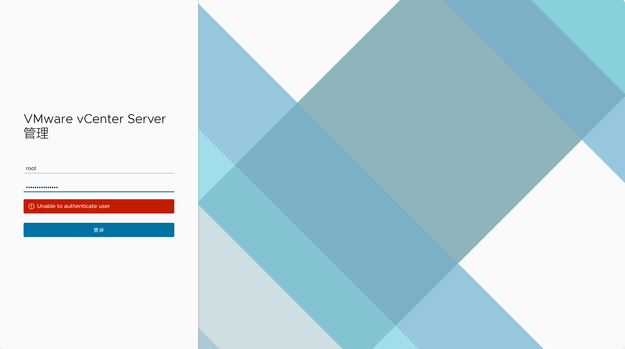如果你尝试登录 VCF 管理域 vCenter Server VAMI 管理界面,并尝试使用 root 用户登录,结果显示不能认证用户。