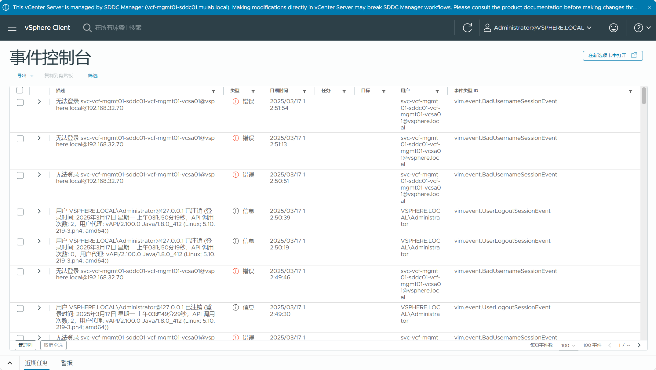 如果你登录 vSphere Client,在 vCenter Server“事件控制台”中,可能也会发现同上述日志一样的错误信息。