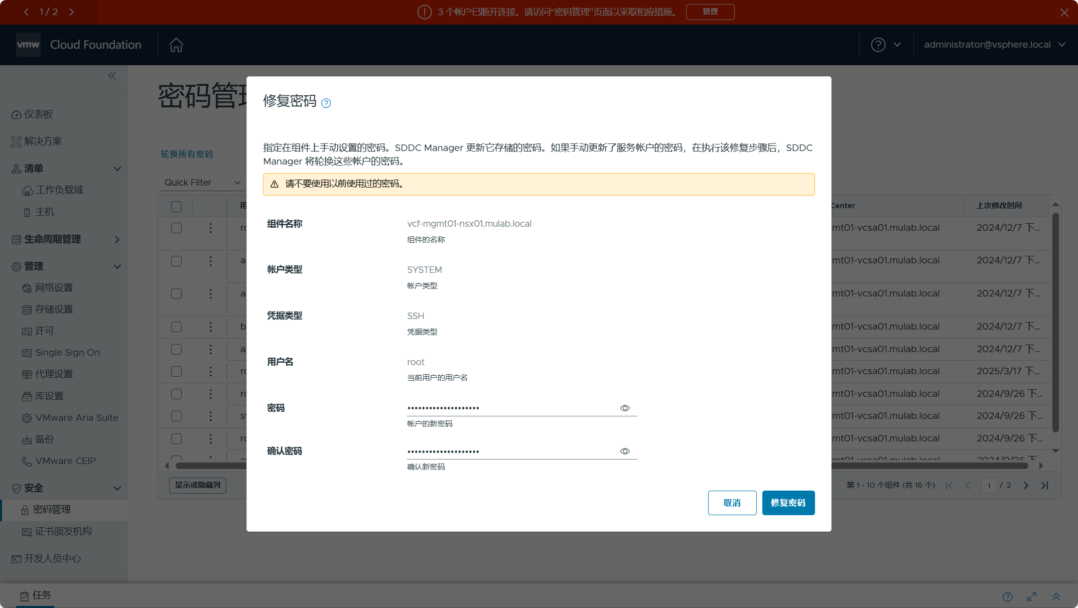 完成 NSX Manager 账户密码修改后,回到 SDDC Manager 密码管理视图,点击用户旁边的“修复密码”,输入修改后的新密码即可。