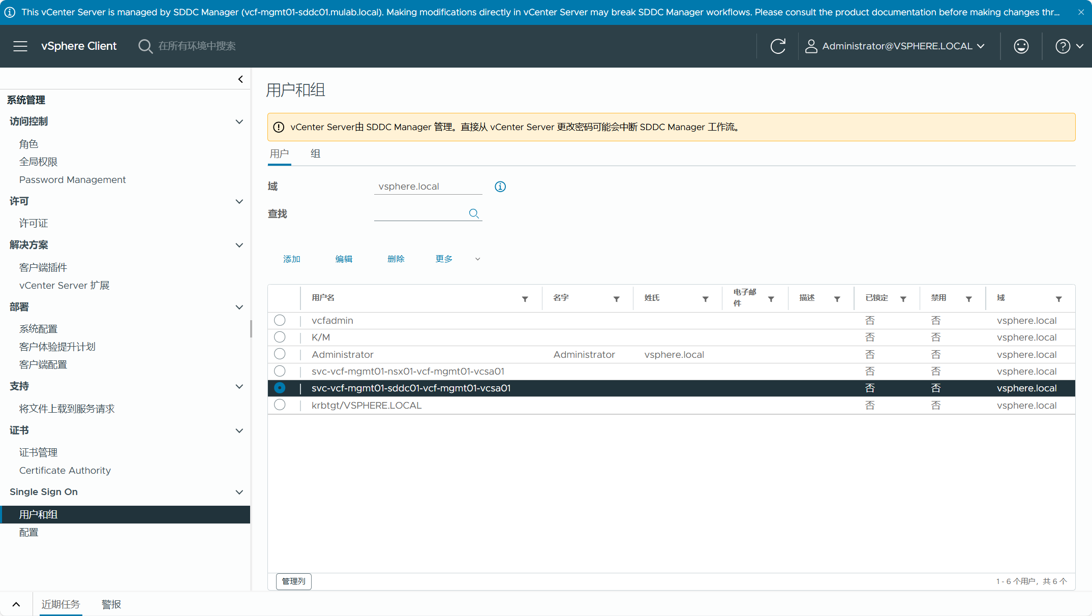 然后登录到 vCenter Server(vSphere Client),在系统管理中找到用户管理,在用户中选择 SSO 域(vsphere.local),找到服务账户并点击“编辑”,将密码修改为上面获取到的密码。