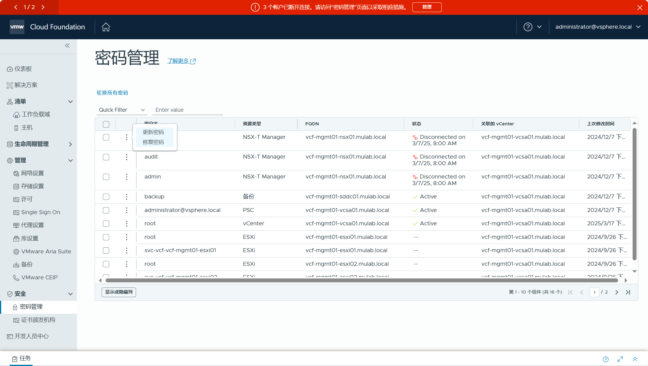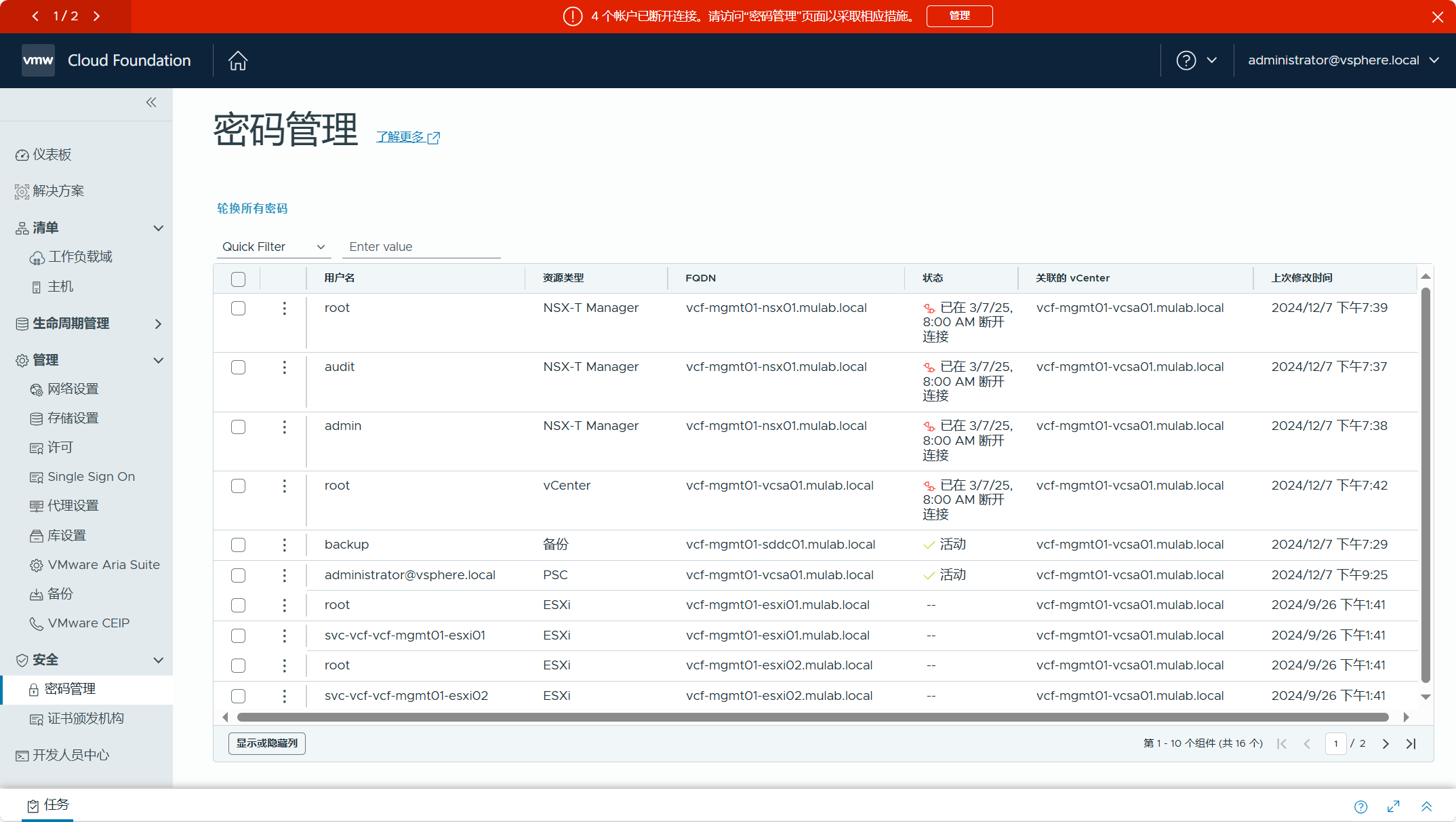 如果一切顺利,应该能正常登录到 SDDC Manager UI。导航到安全->密码管理,可以发现 vCenter Server 和 NSX Manager 组件的用户因为密码过期都已经从 SDDC Manager 断开连接。