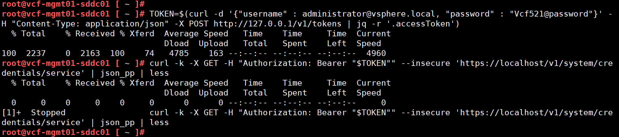 curl -k -X GET -H "Authorization: Bearer "$TOKEN"" --insecure 'https://localhost/v1/system/credentials/service' | json_pp | less