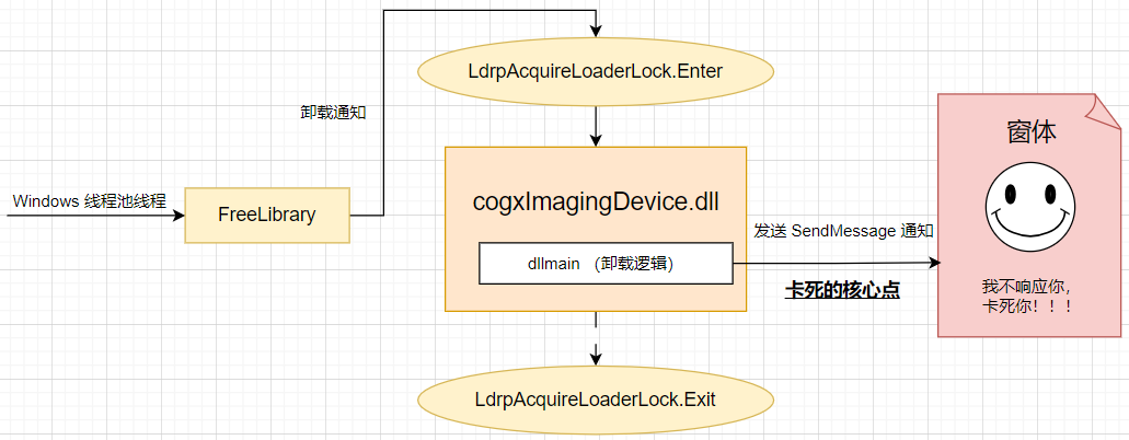 这是一个 .NET某工控自动化控制系统(https://www.cnblogs.com/huangxincheng/p/16544462.html) 的卡死故障,经过一顿分析之后,找到了最后的卡死原因,即 cogxImagingDevice.dll 中有一个 DllMain 的卸载通知,熟悉 win32 的朋友都知道,代码经过 DllMain 的时候会持有一个 LdrpAcquireLoaderLock 进程加载锁,在持锁过程中它突然向一个窗体发送 SendMessageW 消息,可惜的是这个窗体没有给予响应,一直卡死在这里,这就导致 进程加载锁 迟迟得不到释放,引发系统性卡死。。。