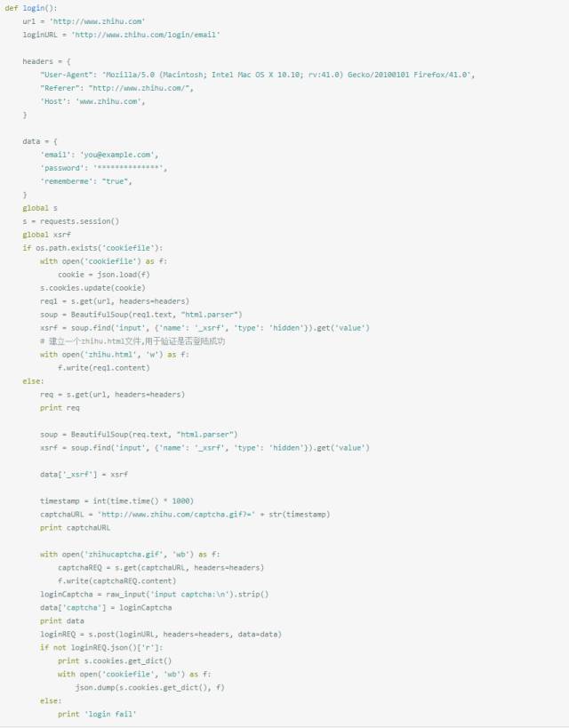 Python爬虫爬取知乎 模拟登录要想实现对知乎的爬取,首先我们要实现模拟登录,因为不登录的话好多信息我们都无法访问。下面是登录函数,这里我直接使用了知乎用户fireling的登录函数,具体如下。其中你要在函数中的data里填上你的登录账号和密码,然后在爬虫之前先执行这个函数,不出意外的话你就登录成功了,这时你就可以继续抓取想要 的数据。注意,在首...