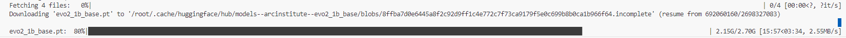 1 cd /root/autodl-tmp/evo2/evo2_models #在项目文件夹中单独创建一个evo2_model文件夹用于保存下载的模型,这样就不用每次调用时重新下载了 2 3 #设置huggingface-cli下载的镜像网址 4 export HF_ENDPOINT=https://hf-mirror.com 5 6 #下载evo2_1b_base模型为例 7 huggingface-cli download --resume-download arcinstitute/evo2_1b_base --local-dir /root/autodl-tmp/evo2/evo2_models