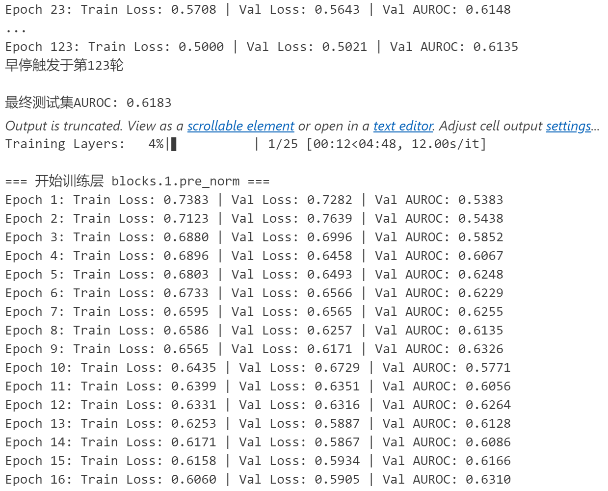 1 # ========== 训练流程 ========== 2 def train_for_layer(layer_name): 3 """单层训练流程""" 4 print(f"\n=== 开始训练层 {layer_name} ===") 5 6 # 加载数据 7 X, y = load_layer_data(layer_name) 8 9 # 数据划分 10 X_temp, X_test, y_temp, y_test = train_test_split( 11 X, y, test_size=0.2, random_state=42, stratify=y 12 ) 13 X_train, X_val, y_train, y_val = train_test_split( 14 X_temp, y_temp, test_size=0.25, random_state=42, stratify=y_temp 15 ) 16 17 # 转换为PyTorch Dataset 18 train_dataset = TensorDataset(torch.FloatTensor(X_train), torch.FloatTensor(y_train).unsqueeze(1)) 19 val_dataset = TensorDataset(torch.FloatTensor(X_val), torch.FloatTensor(y_val).unsqueeze(1)) 20 test_dataset = TensorDataset(torch.FloatTensor(X_test), torch.FloatTensor(y_test).unsqueeze(1)) 21 22 # ========== 训练配置 ========== 23 device = torch.device("cuda" if torch.cuda.is_available() else "cpu") 24 model = BRCA1Classifier(X.shape[1]).to(device) 25 26 # 优化器和损失函数 27 optimizer = torch.optim.Adam(model.parameters(), lr=3e-4) 28 criterion = nn.BCELoss() 29 30 # 学习率调度器 31 scheduler = ReduceLROnPlateau( 32 optimizer, 33 mode='max', 34 factor=0.5, 35 patience=20, 36 min_lr=1e-6 37 ) 38 39 # 数据加载器 40 train_loader = DataLoader(train_dataset, batch_size=128, shuffle=True) 41 val_loader = DataLoader(val_dataset, batch_size=128) 42 test_loader = DataLoader(test_dataset, batch_size=128) 43 44 # ========== 训练循环 ========== 45 best_auc = 0 46 patience_counter = 0 47 max_patience = 100 48 49 for epoch in range(500): 50 # 训练阶段 51 model.train() 52 train_loss = 0 53 for inputs, labels in train_loader: 54 inputs, labels = inputs.to(device), labels.to(device) 55 56 optimizer.zero_grad() 57 outputs = model(inputs) 58 loss = criterion(outputs, labels) 59 60 # 梯度裁剪 61 torch.nn.utils.clip_grad_norm_(model.parameters(), max_norm=1.0) 62 63 loss.backward() 64 optimizer.step() 65 train_loss += loss.item() * inputs.size(0) 66 67 # 验证阶段 68 model.eval() 69 val_loss = 0 70 y_true, y_pred = [], [] 71 with torch.no_grad(): 72 for inputs, labels in val_loader: 73 inputs, labels = inputs.to(device), labels.to(device) 74 outputs = model(inputs) 75 val_loss += criterion(outputs, labels).item() * inputs.size(0) 76 y_true.extend(labels.cpu().numpy()) 77 y_pred.extend(outputs.cpu().numpy()) 78 79 # 计算指标 80 train_loss /= len(train_loader.dataset) 81 val_loss /= len(val_loader.dataset) 82 val_auc = roc_auc_score(y_true, y_pred) 83 84 # 学习率调整 85 scheduler.step(val_auc) 86 87 # 早停机制 88 if val_auc > best_auc: 89 best_auc = val_auc 90 patience_counter = 0 91 torch.save(model.state_dict(), 'best_model.pth') 92 else: 93 patience_counter += 1 94 if patience_counter >= max_patience: 95 print(f"早停触发于第{epoch}轮") 96 break 97 98 # 打印进度 99 print(f"Epoch {epoch+1}: " 100 f"Train Loss: {train_loss:.4f} | " 101 f"Val Loss: {val_loss:.4f} | " 102 f"Val AUROC: {val_auc:.4f}") 103 104 # ========== 最终评估 ========== 105 model.load_state_dict(torch.load('best_model.pth')) 106 model.eval() 107 y_test_true, y_test_pred = [], [] 108 with torch.no_grad(): 109 for inputs, labels in test_loader: 110 inputs, labels = inputs.to(device), labels.to(device) 111 outputs = model(inputs) 112 y_test_true.extend(labels.cpu().numpy()) 113 y_test_pred.extend(outputs.cpu().numpy()) 114 115 test_auc = roc_auc_score(y_test_true, y_test_pred) 116 print(f"\n最终测试集AUROC: {test_auc:.4f}") 117 118 # 保存结果 119 sanitized = layer_name.replace('.', '_') 120 torch.save(model.state_dict(), results_dir/f"best_model_{sanitized}.pth") 121 np.save(results_dir/f"test_pred_{sanitized}.npy", y_test_pred) 122 123 return test_auc