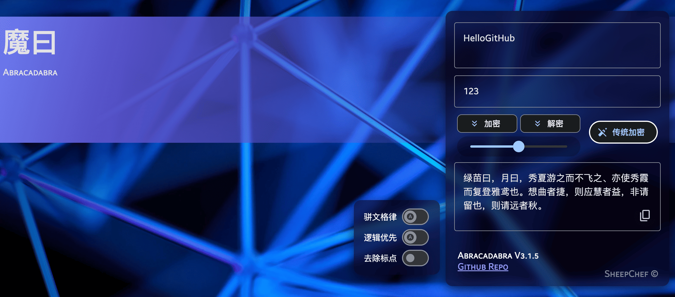 15、Abracadabra:古文风文本加密工具。这是一款兼具趣味性与安全性的文本加密工具,支持将任意明文加密为仿真古文或安全密文。它采用 AES-256 加密算法和三重转轮混淆技术,古文仿真加密功能参考《古文观止》《古文辞类纂》等古代典籍。来自 @SheepChef 的分享