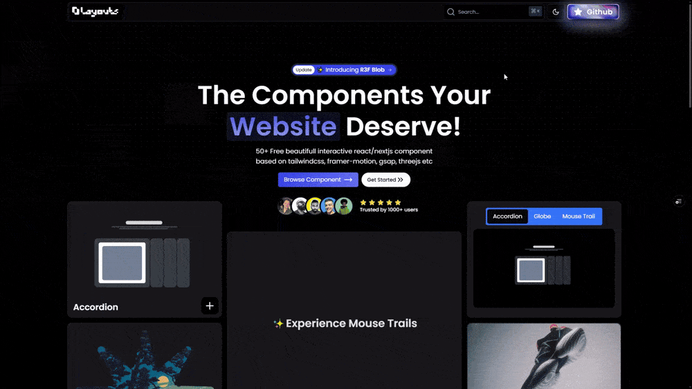 18、uilayouts:免费高质量 React 动效组件库。这是一个专注于创意设计的 React/Next.js 组件库,内含 100 多个基于 Tailwind CSS、Framer Motion 和 GSAP 等技术构建的免费且美观的 UI 组件。