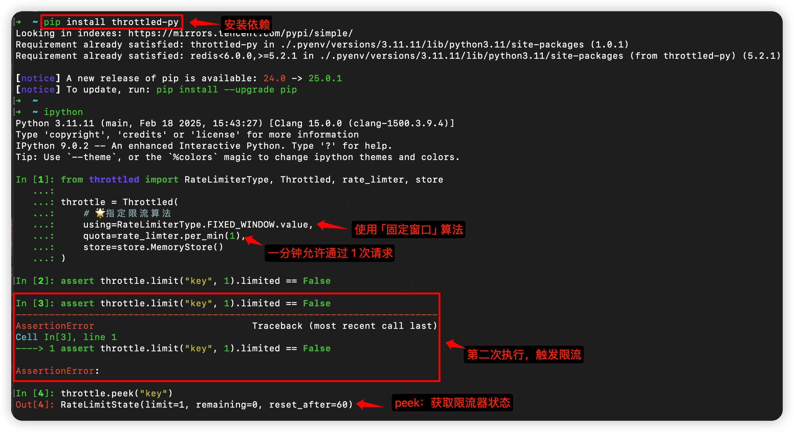 25、throttled-py:开箱即用的 Python 限流库。这是一款轻量且灵活的 Python 限流库,同步/异步皆可用。它支持多种限流算法,包括固定窗口、滑动窗口、令牌桶、漏桶和 GCRA,适配 Redis 存储后端,并提供函数、装饰器和上下文管理器等多种灵活用法。