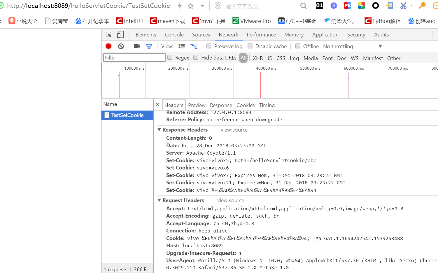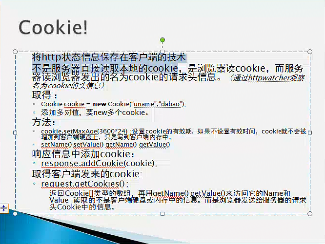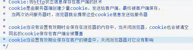 1 package com.bjsxt.cookie; 2 3 import java.io.IOException; 4 import java.net.URLEncoder; 5 6 import javax.servlet.ServletException; 7 import javax.servlet.annotation.WebServlet; 8 import javax.servlet.http.Cookie; 9 import javax.servlet.http.HttpServlet; 10 import javax.servlet.http.HttpServletRequest; 11 import javax.servlet.http.HttpServletResponse; 12 13 /** 14 * Servlet implementation class TestSetCookie 15 */ 16 @WebServlet("/TestSetCookie") 17 public class TestSetCookie extends HttpServlet { 18 19 @Override 20 protected void service(HttpServletRequest req, HttpServletResponse resp) 21 throws ServletException, IOException { 22 System.out.println("TestSetCookie.service()"); 23 //创建cookie 24 Cookie cookie01=new Cookie("vivo","vivox5"); 25 Cookie cookie02=new Cookie("vivo","vivox6"); 26 Cookie cookie03=new Cookie("vivo","vivox7"); 27 Cookie cookie04=new Cookie("vivo","vivox21"); 28 //设置中文编码cookie 29 Cookie cookie05=new Cookie("vivo",URLEncoder.encode("步步高五","utf-8")); 30 //设置cookie信息的有效期,setmaxage是以秒为单位 31 cookie03.setMaxAge(3*24*3600); 32 cookie04.setMaxAge(3*24*3600); 33 //设置cookie的访问路径 34 cookie01.setPath(req.getContextPath()+"/abc"); 35 36 //发送给客户端 37 resp.addCookie(cookie01); 38 resp.addCookie(cookie02); 39 resp.addCookie(cookie03); 40 resp.addCookie(cookie04); 41 resp.addCookie(cookie05); 42 } 43 44 45 }