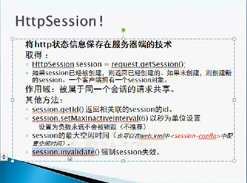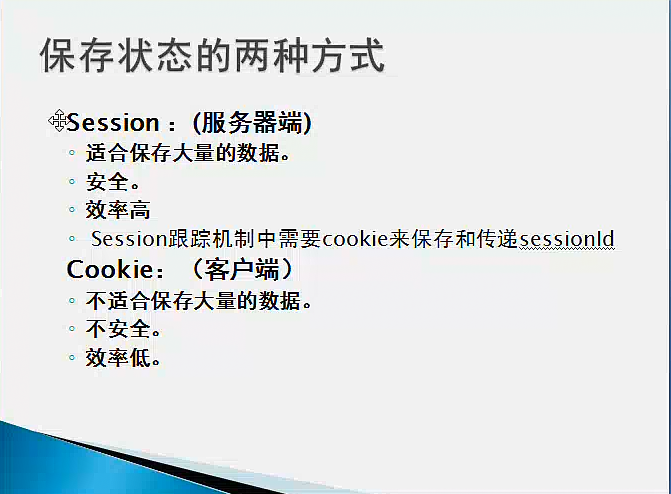 1 package com.bjsxt.session; 2 3 import java.io.IOException; 4 5 import javax.servlet.ServletException; 6 import javax.servlet.annotation.WebServlet; 7 import javax.servlet.http.HttpServlet; 8 import javax.servlet.http.HttpServletRequest; 9 import javax.servlet.http.HttpServletResponse; 10 import javax.servlet.http.HttpSession; 11 /** 12 * session:将http状态信息保存在服务器端的技术 13 * seesion是客户端和服务器之间的一次会话 14 * 会话-开始:当用户第一访问服务器时候就开始了 15 * 结束:客户端--关闭浏览器(清除cookie) 16 * 服务器--A:超过有效期 在tomcat中web.xml中配置 <session-config> 17 <session-timeout>30</session-timeout> 18 </session-config> 19 * B:在本项目中web.xml配置session-config 20 * C:设置session的最大不活动周期 21 * D:服务器关闭 22 * 23 * 24 * cookie:不安全,效率低,容量小,但是不能舍弃这门技术,因为session的跟踪机制需要cookie来保存JSESSIONID 25 */ 26 @WebServlet("/HelloSession") 27 public class HelloSession extends HttpServlet { 28 29 @Override 30 protected void service(HttpServletRequest req, HttpServletResponse resp) 31 throws ServletException, IOException { 32 System.out.println("HelloSession.service()"); 33 34 //获取session 35 HttpSession hs = req.getSession(); 36 37 //设置sesssion的最大不活动周期 38 //hs.setMaxInactiveInterval(10); 39 40 //强制sesssion失效 41 //hs.setMaxInactiveInterval(0); 42 //hs.invalidate(); 43 44 //获取sessionid 45 String hsid = hs.getId(); 46 System.out.println("HelloSession.service()sessionid:"+hsid); 47 48 } 49 50 51 }