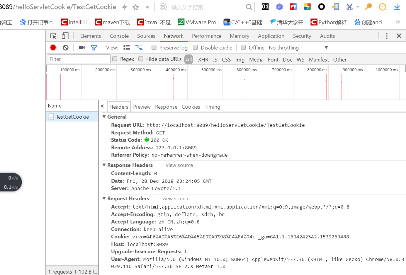 1 package com.bjsxt.cookie; 2 3 import java.io.IOException; 4 import java.net.URLDecoder; 5 6 import javax.servlet.ServletException; 7 import javax.servlet.annotation.WebServlet; 8 import javax.servlet.http.Cookie; 9 import javax.servlet.http.HttpServlet; 10 import javax.servlet.http.HttpServletRequest; 11 import javax.servlet.http.HttpServletResponse; 12 13 /** 14 * Servlet implementation class TestGetCookie 15 */ 16 @WebServlet("/TestGetCookie") 17 public class TestGetCookie extends HttpServlet { 18 19 @Override 20 protected void service(HttpServletRequest req, HttpServletResponse resp) 21 throws ServletException, IOException { 22 System.out.println("TestGetCookie.service()"); 23 //获取cookie--获取请求头里的cookie(从浏览器获取) 24 Cookie[] cookies=req.getCookies(); 25 //获取cookie的名称和值 26 for(int i=0;i<cookies.length;i++){ 27 System.out.println("cookie:"+cookies[i].getName()+":"+ URLDecoder.decode(cookies[i].getValue(),"utf-8")); 28 } 29 } 30 31 }