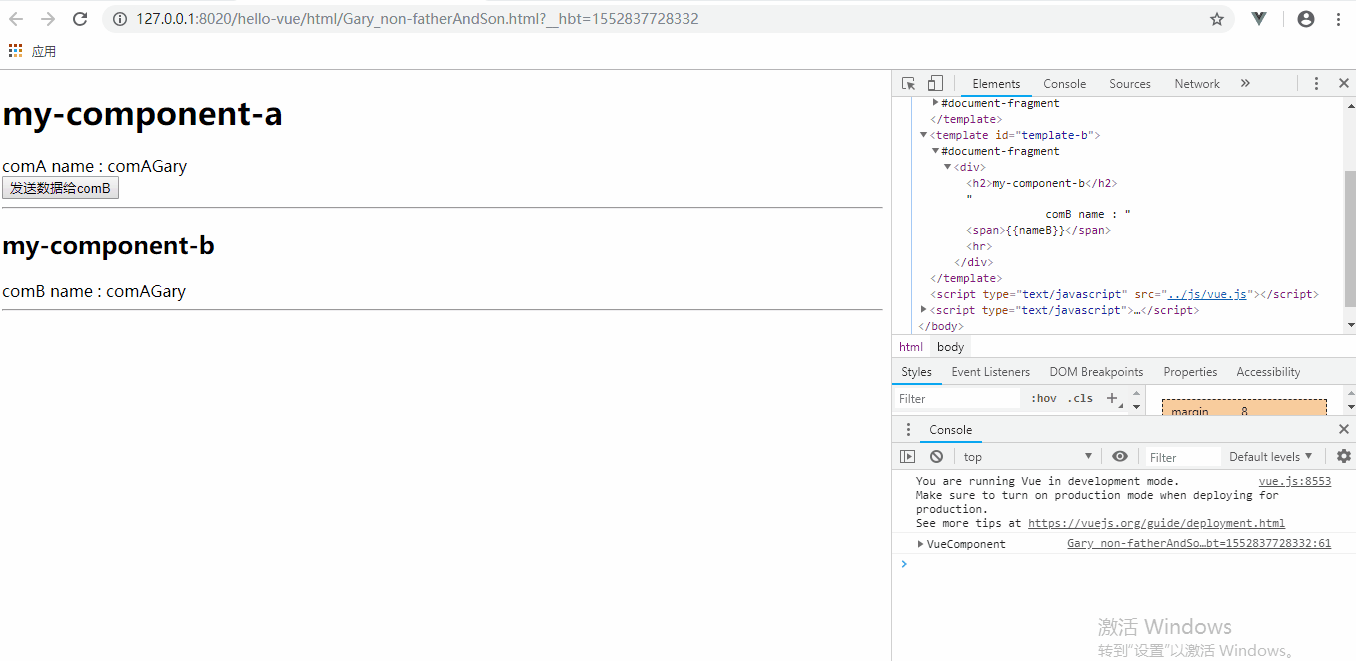 <template id="template-a"> <div> <h1>my-component-a</h1> comA name : <span>{{name}}</span><br /> <button @click="sendData">发送数据给comB</button> <hr /> </div> </template> <template id="template-b"> <div> <h2>my-component-b</h2> comB name : <span>{{nameB}}</span> <hr /> </div> </template>