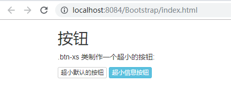 <!DOCTYPE html> <html> <head> <meta charset="utf-8"> <title>菜鸟教程(runoob.com)</title> <link rel="stylesheet" href="https://cdn.staticfile.org/twitter-bootstrap/3.3.7/css/bootstrap.min.css"> <script src="https://cdn.staticfile.org/jquery/2.1.1/jquery.min.js"></script> <script src="https://cdn.staticfile.org/twitter-bootstrap/3.3.7/js/bootstrap.min.js"></script> </head> <body> <div class="container"> <h2>按钮</h2> <p> .btn-xs 类制作一个超小的按钮:</p> <button type="button" class="btn btn-default btn-xs">超小默认的按钮</button> <button type="button" class="btn btn-info btn-xs">超小信息按钮</button> </div> </body> </html>