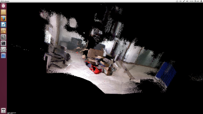 我让小车在实验室的一个角上转了几圈。它把中间放置的一堆箱子(实际上是垃圾)都扫出来了。当你觉得满意后,再按下Space键,停止程序。然后从菜单中选出需要保存的东西:机器人的轨迹,最终点云图,等等。轨迹是一个txt文件,而点云图则一个pcd,在安装PCL之后调用pcl_viewer即可查看。