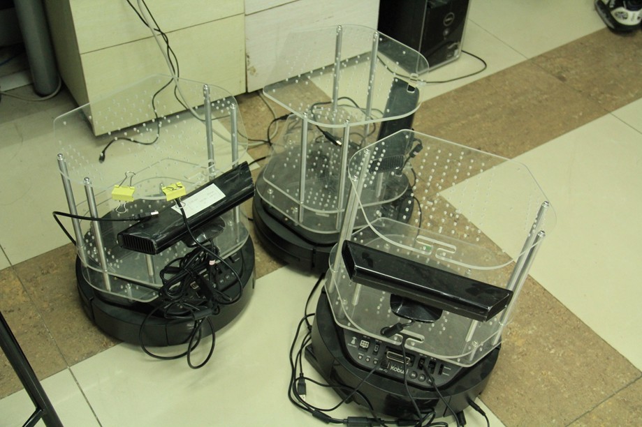 机器人的主要部件就是它的底座和上头的Kinect啦。座子自带惯导,可以估计自己的位置;Kinect么,大家都知道了,不多讲。事实上今天要跑的rgbd-slam-v2不需要座子,只要一台kinect就能动起来。我们用不着那么多机器人,只用一个就行啦(就是贴了标签那台)。