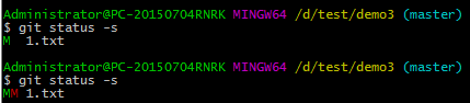 假设修改两次,第一次修改完后使用git add .然后使用git status -s查看, 第二次修改完后直接使用git status -s查看