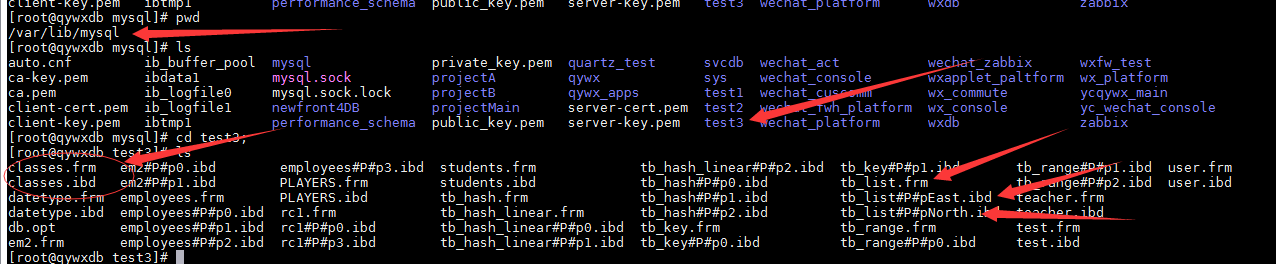 注意:我们数据库目录存放着我们所有数据库的信息,包括数据库中表的信息和表中数据。其中每个数据库会在该目录下创建一个以数据库名命名文件夹,该文件夹下主要包含.frm和.idb结尾的文件,其中.idb(一个表对应一个)文件存放着每个表的数据。如果我们的表是分区表则一个表对用多个.idb文件。分析下图箭头
