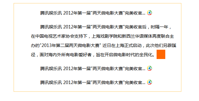 <!DOCTYPE html PUBLIC "-//W3C//DTD XHTML 1.0 Transitional//EN" "http://www.w3.org/TR/xhtml1/DTD/xhtml1-transitional.dtd"> <html xmlns="http://www.w3.org/1999/xhtml"> <head> <meta http-equiv="Content-Type" content="text/html; charset=utf-8" /> <title>无标题文档</title> <style> *{ font-size:14px;} .ico{ background:url(http://mat1.gtimg.com/www/icon/favicon2.ico) no-repeat center ; cursor:pointer; display:inline-block; text-indent:-999px; width:28px;} .closeTag{background:#F60; cursor:pointer;} ul{ width:500px; border:1px solid #FC6; list-style:none;} ul li{ margin:15px; line-height:30px; text-indent:30px;} </style> </head> <script> //toggle点评 function toggleWords(obj) { var childs = obj.parentNode.childNodes; var longstr,shortstr,textnode; for(var i=0,len=childs.length;i<len;i++) {http://www.baidu.com/img/bdlogo.gif //需要操作的文本节点 if(childs[i].nodeType == 3 && textnode == undefined) { textnode = childs[i]; } //详细信息 if(childs[i].nodeType == 1 && childs[i].name == 'long') { longstr = childs[i].value; } //简短信息 if(childs[i].nodeType == 1 && childs[i].name == 'short') { shortstr = childs[i].value; } } if(longstr == undefined || shortstr == undefined || textnode == undefined) { return ; } if(obj.innerHTML == '展开') { textnode.nodeValue = longstr; obj.innerHTML = '收起'; obj.className = 'ico closeTag'; }else{ textnode.nodeValue = shortstr; obj.innerHTML = '展开'; obj.className = 'ico'; } } </script> <body> <dd > <ul> <li> 腾讯娱乐讯 2012年第一届"两天微电影大赛"完美收官...<span class="ico" onclick="toggleWords(this); return false;">展开</span> <input name="long" type="hidden" value="腾讯娱乐讯 2012年第一届"两天微电影大赛"完美收官后,时隔一年, 在中国电视艺术家协会支持下,上海戏剧学院和新西兰华语媒体再度联合主办的"2013年第二届两天微电影大赛" 近日在上海正式启动,此次他们另辟蹊径,面对海内外所有电影爱好者,旨在开启微电影时代的全民化。" /> <input name="short" type="hidden" value="腾讯娱乐讯 2012年第一届"两天微电影大赛"完美收官..." /> </li> <li> 腾讯娱乐讯 2012年第一届"两天微电影大赛"完美收官...<span class="ico" onclick="toggleWords(this); return false;">展开</span> <input name="long" type="hidden" value="腾讯娱乐讯 2012年第一届"两天微电影大赛"完美收官后,时隔一年, 在中国电视艺术家协会支持下,上海戏剧学院和新西兰华语媒体再度联合主办的"2013年第二届两天微电影大赛" 近日在上海正式启动,此次他们另辟蹊径,面对海内外所有电影爱好者,旨在开启微电影时代的全民化。" /> <input name="short" type="hidden" value="腾讯娱乐讯 2012年第一届"两天微电影大赛"完美收官..." /> </li> <li> 腾讯娱乐讯 2012年第一届"两天微电影大赛"完美收官...<span class="ico" onclick="toggleWords(this); return false;">展开</span> <input name="long" type="hidden" value="腾讯娱乐讯 2012年第一届"两天微电影大赛"完美收官后,时隔一年, 在中国电视艺术家协会支持下,上海戏剧学院和新西兰华语媒体再度联合主办的"2013年第二届两天微电影大赛" 近日在上海正式启动,此次他们另辟蹊径,面对海内外所有电影爱好者,旨在开启微电影时代的全民化。" /> <input name="short" type="hidden" value="腾讯娱乐讯 2012年第一届"两天微电影大赛"完美收官..." /> </li> <li> 腾讯娱乐讯 2012年第一届"两天微电影大赛"完美收官...<span class="ico" onclick="toggleWords(this); return false;">展开</span> <input name="long" type="hidden" value="腾讯娱乐讯 2012年第一届"两天微电影大赛"完美收官后,时隔一年, 在中国电视艺术家协会支持下,上海戏剧学院和新西兰华语媒体再度联合主办的"2013年第二届两天微电影大赛" 近日在上海正式启动,此次他们另辟蹊径,面对海内外所有电影爱好者,旨在开启微电影时代的全民化。" /> <input name="short" type="hidden" value="腾讯娱乐讯 2012年第一届"两天微电影大赛"完美收官..." /> </li> </ul> </dd> </body> </html>