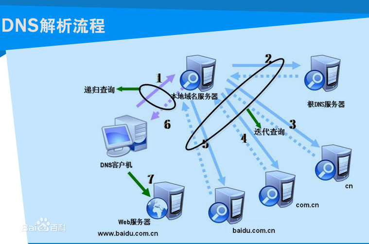 5、如果本地DNS服务器本地区域文件与缓存解析都失效,则根据本地DNS服务器的设置(是否设置转发器)进行查询,如果未用转发模式,本地DNS就把请求发至根DNS,根DNS服务器收到请求后会判断这个域名(.com)是谁来授权管理,并会返回一个负责该顶级域名服务器的一个IP。本地DNS服务器收到IP信息后,将会联系负责.com域的这台服务器。这台负责.com域的服务器收到请求后,如果自己无法解析,它就会找一个管理.com域的下一级DNS服务器地址(baidu.com)给本地DNS服务器。当本地DNS服务器收到这个地址后,就会找baiducom域服务器,重复上面的动作,进行查询,直至找到www.qq.com主机。