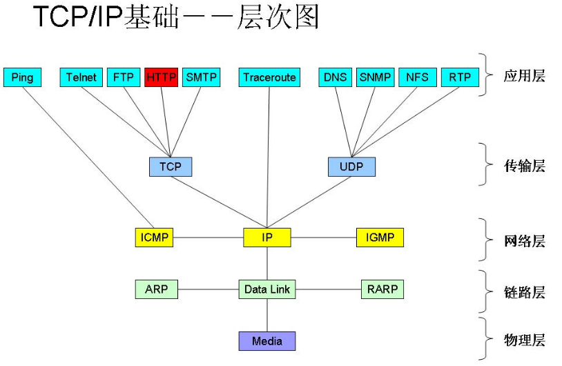 在介绍 HTTP 协议之前,先简单说一下TCP/IP协议的相关内容。TCP/IP协议是分层的,从底层至应用层分别为:物理层、链路层、网络层、传输层和应用层,如下图所示: